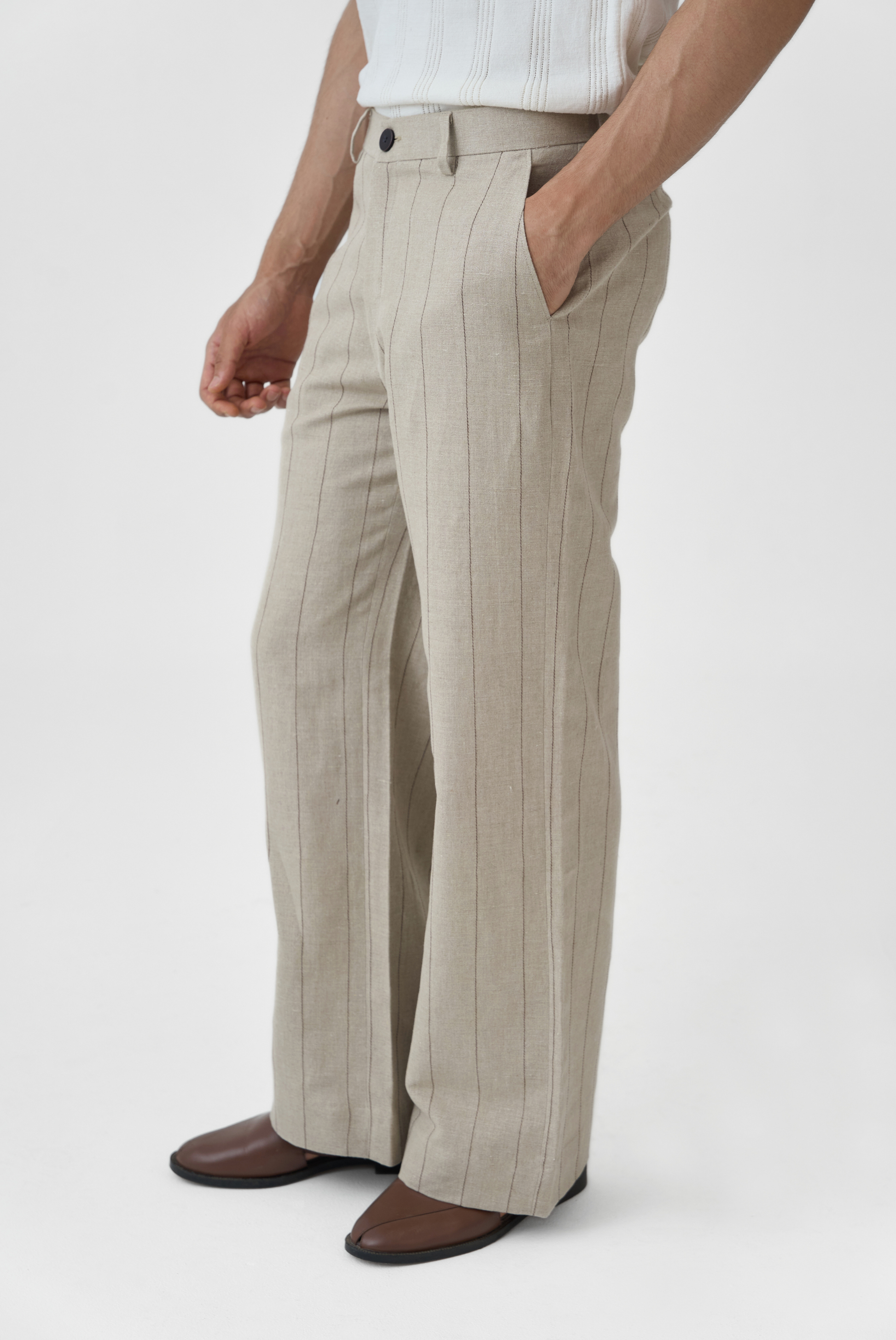A coordinated linen set with subtle contrast stitched stripes across both pieces. Designed to be worn together or separately for relaxed structure.