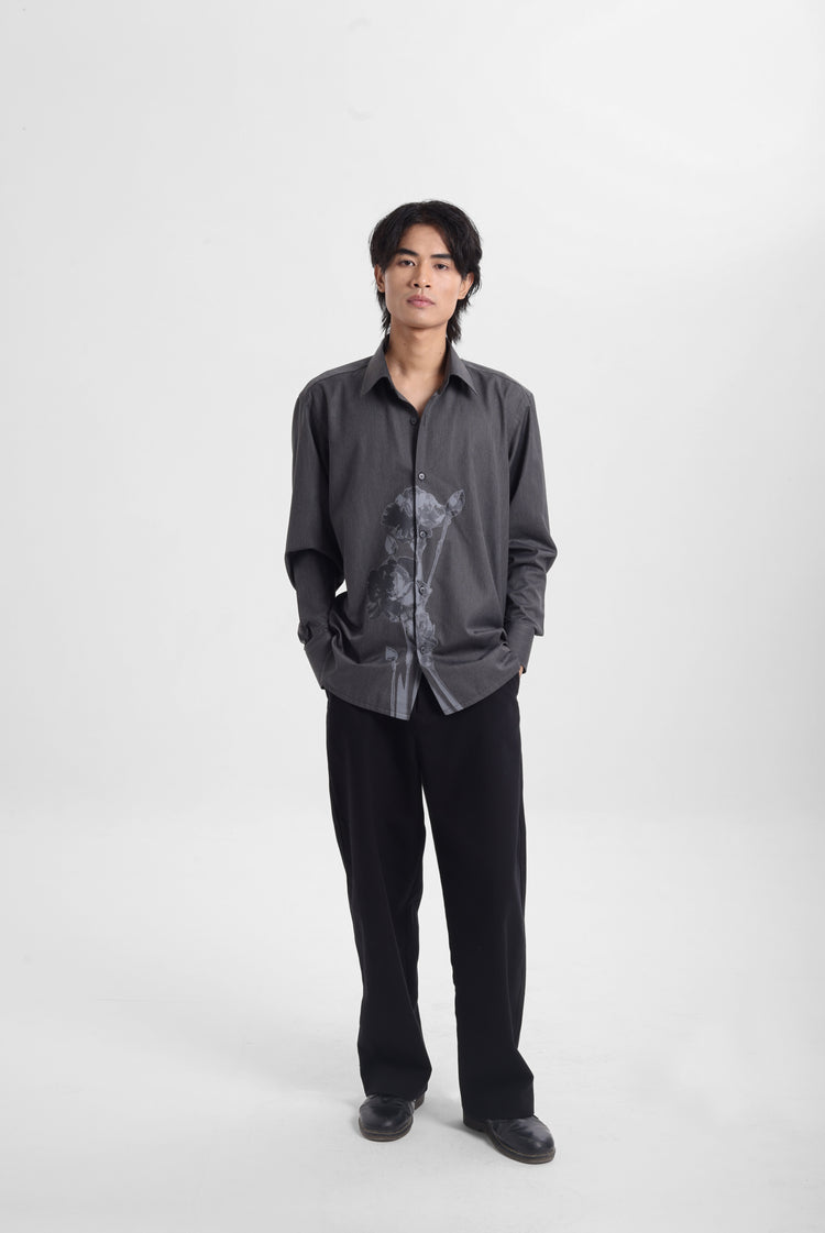 Cut from a midweight merino wool blend, this shirt reimagines classic pinstripes with a soft rose motif. Designed with drop shoulders and a relaxed frame for fluidity and comfort.