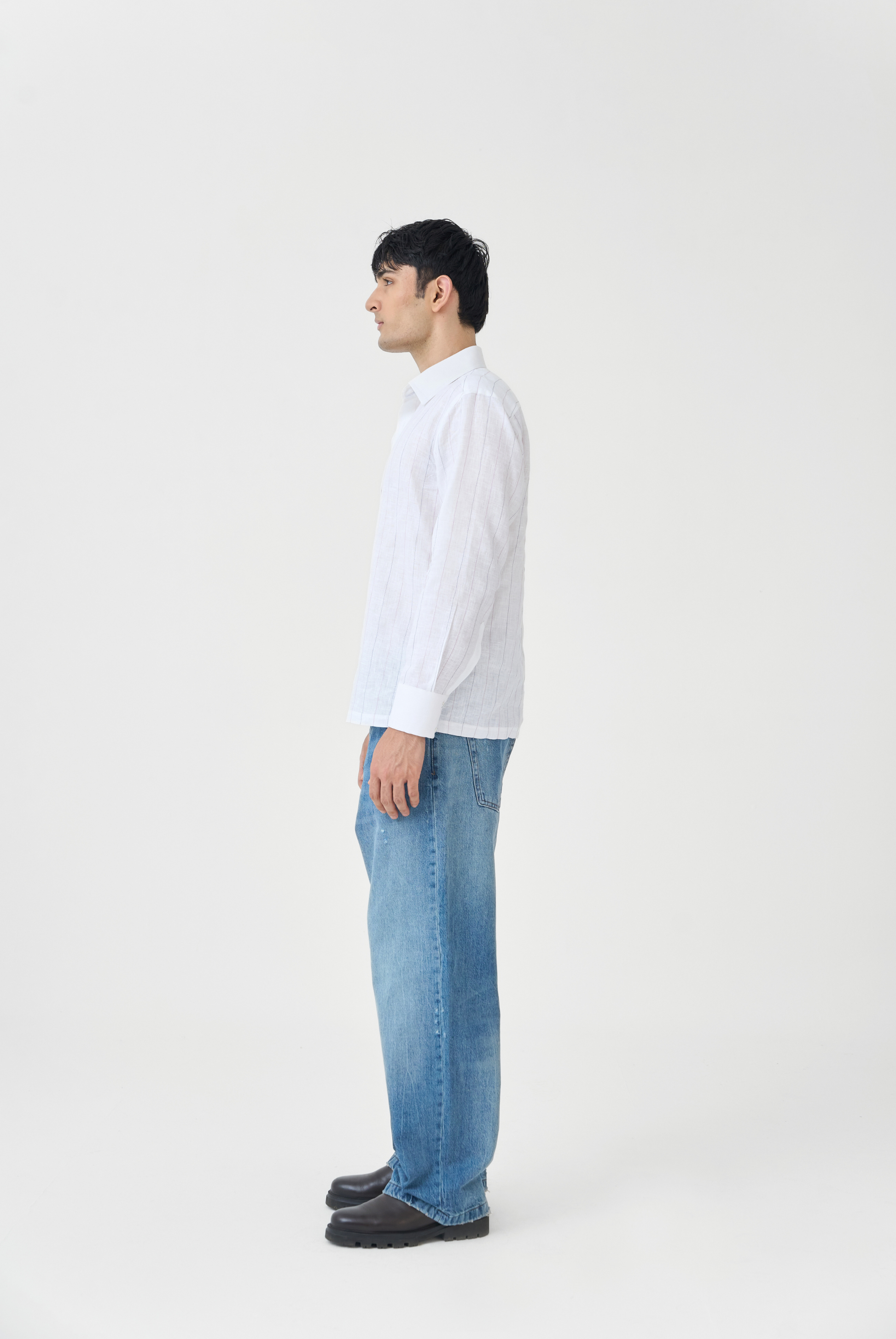 A light linen shirt that reinterprets the classic stripe through twin running stitches in grey and mauve. Designed for movement and ease, it brings softness to a tailored form.