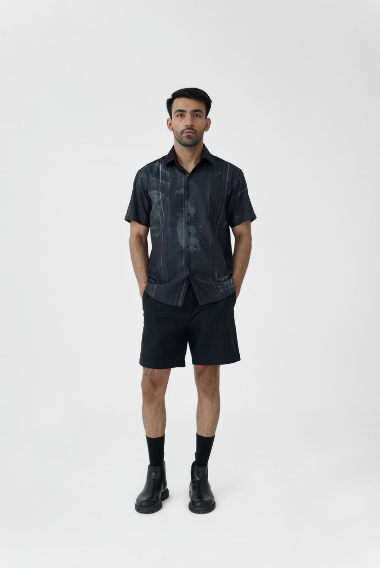 A short sleeved shirt that combines a monochrome floral print with subtle stripes and a denim yoke for textural contrast. Refined yet relaxed in proportion.
