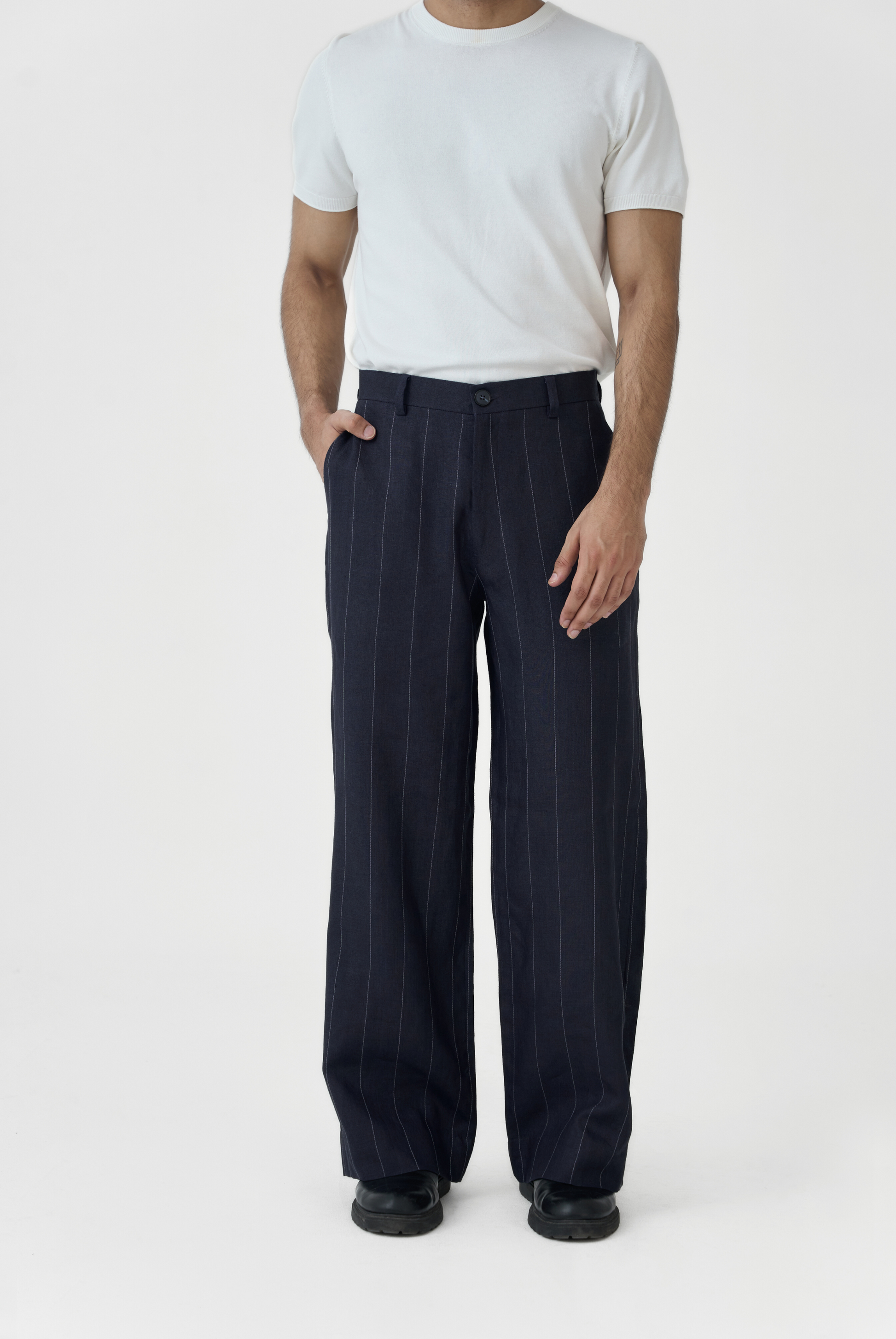 Linen pants hand-dyed in navy blue with contrast stitches forming soft stripes. Designed for comfort with a structured fall.