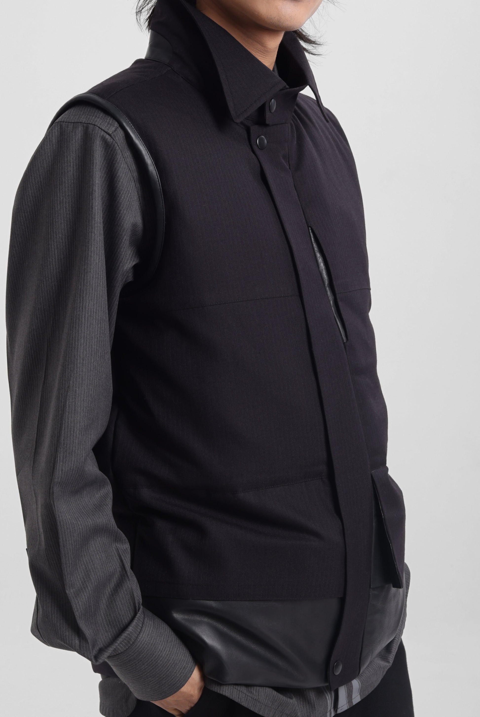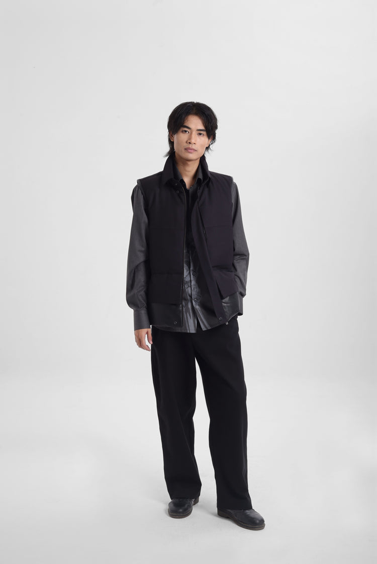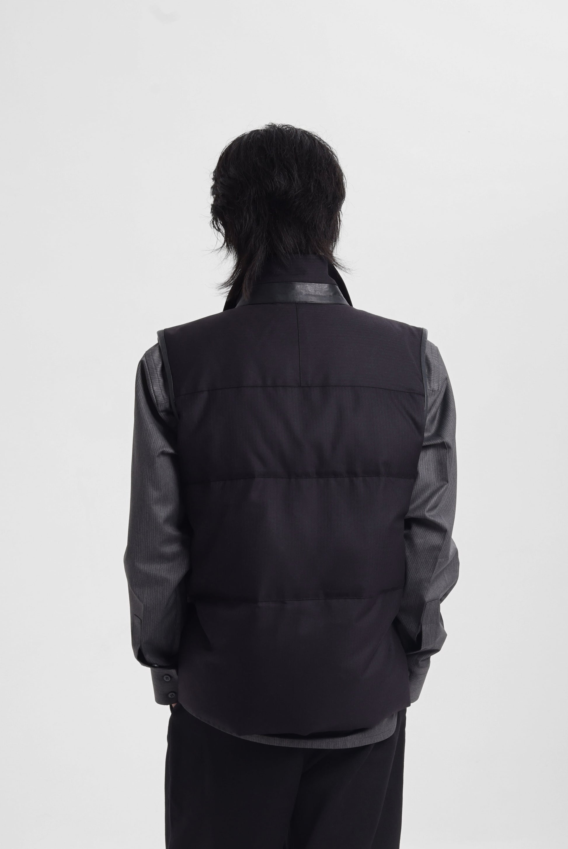 Pairing tailored fabric with genuine black leather trims, this half puffer strikes a balance between structure and comfort. Thoughtful details merge function with contemporary form.