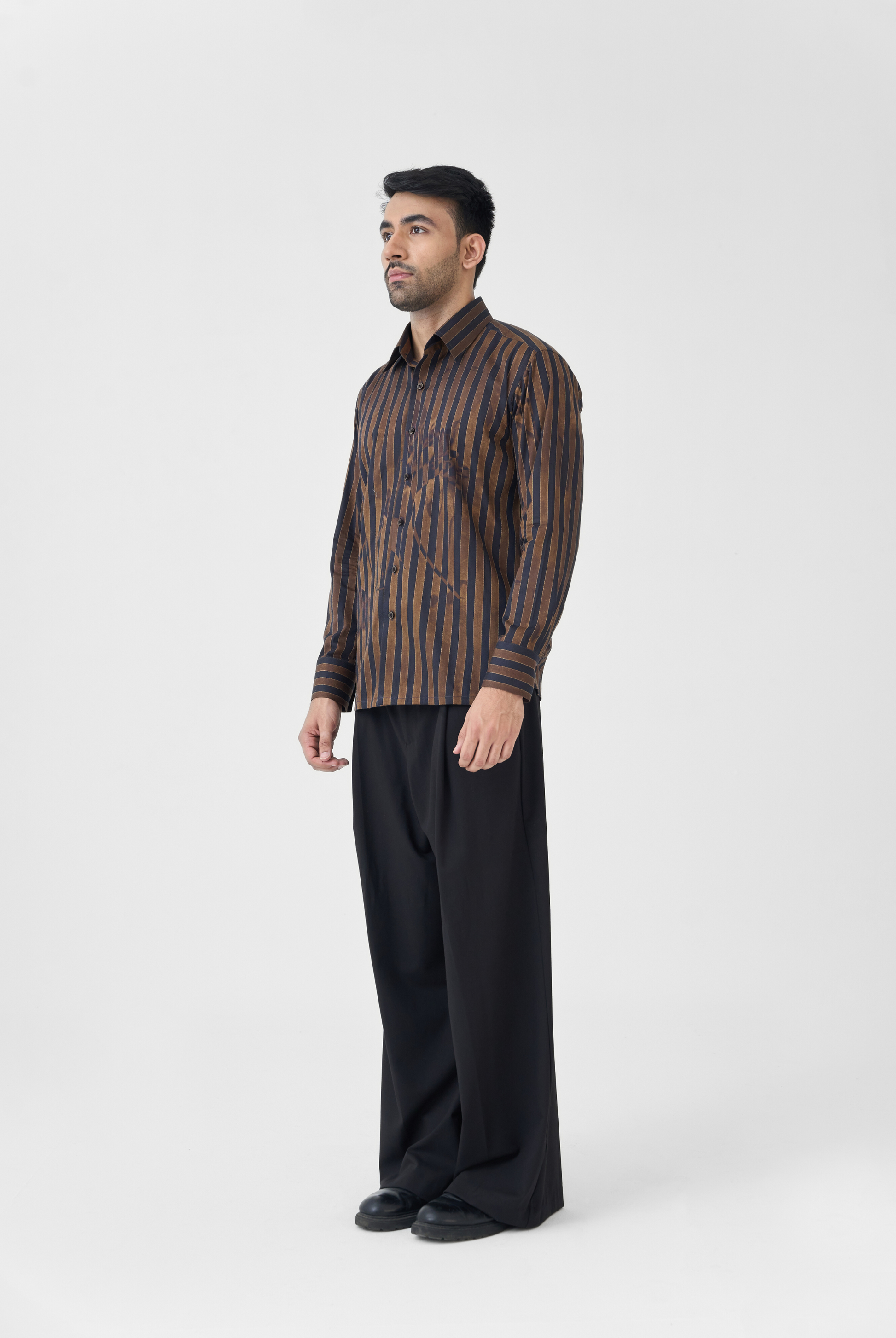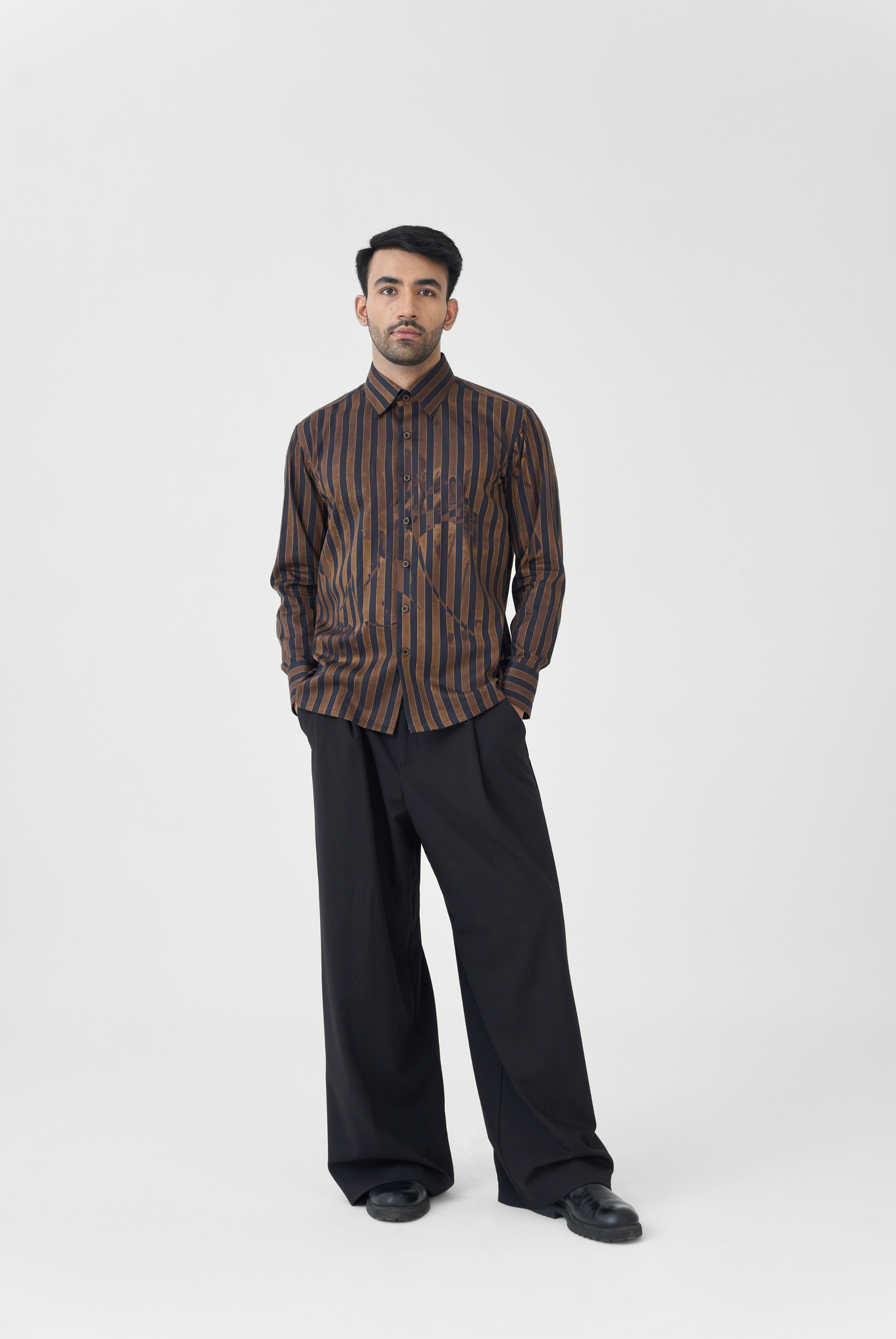 A cotton satin shirt where vertical stitched lines intersect with fine botanical motifs. The interplay of print and texture gives it depth while maintaining a polished surface.